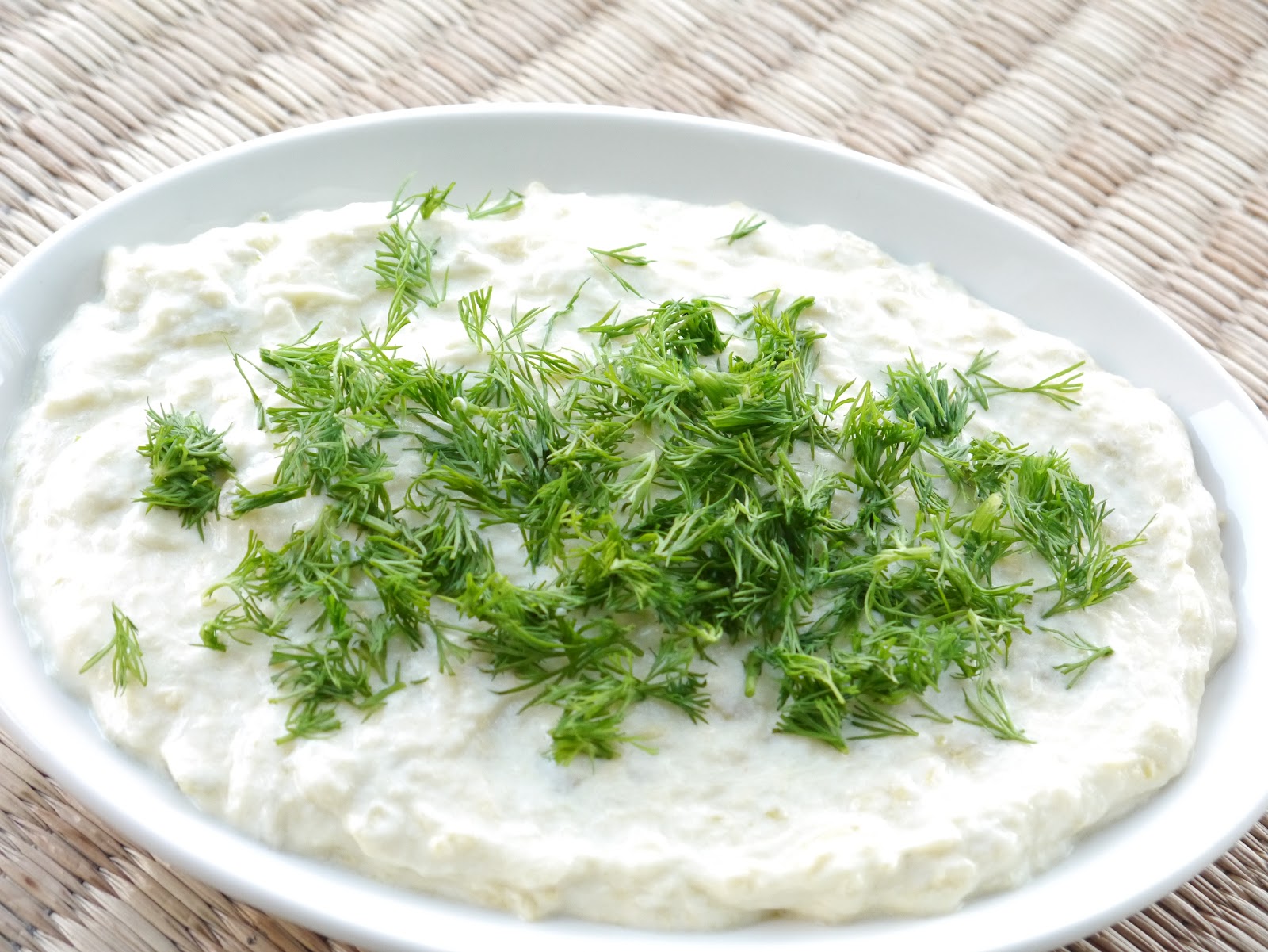 crushed garlic and salt. Mix well with a spoon. Taste it, if you like it more tangy, feel free to add more yogurt. Place it in a serving dish.